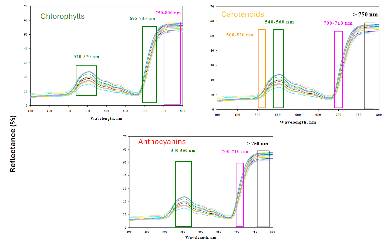 - Green peak (520-570 nm): Increasing pigment concentrations progressively suppress the green reflectance peak, but this region shows modest dynamic range.