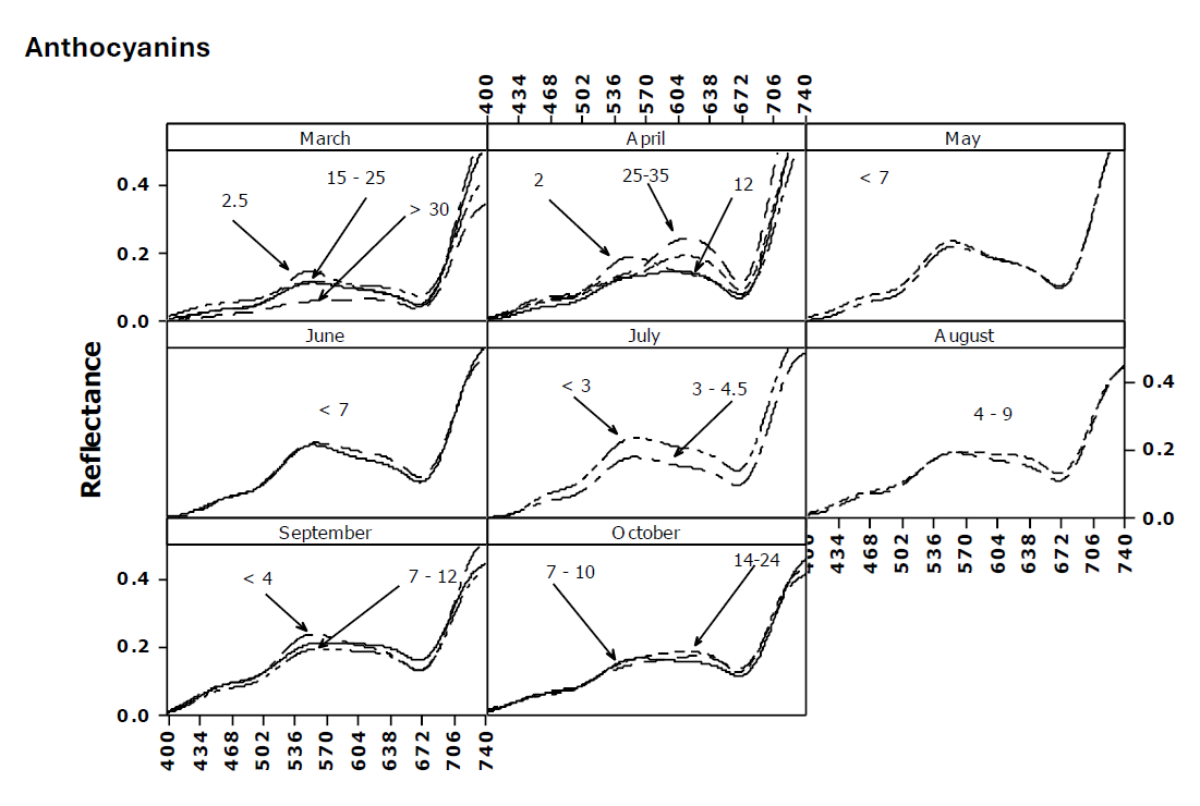 The temporal dynamics of anthocyanin accumulation are particularly striking. Figure 3 displays spectral reflectance patterns across the growing season (March through October) with varying anthocyanin concentrations labeled on each panel. Key observations include: