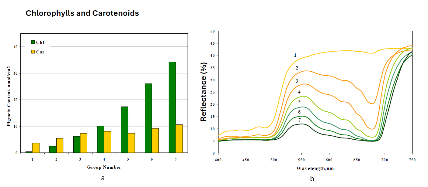 The left panel of Figure 4 shows chlorophyll (Chl, green bars) and carotenoid (Car, yellow bars) concentrations across seven groups with increasing biochemical content and chlorophyll dominance. Group 7 contains approximately 35 nmol/cm² of chlorophyll and 10 nmol/cm² of carotenoids, representing dense, healthy foliage, while Group 1 has minimal pigment content dominated by carotenoids, which is characteristic of stressed or senescent tissue.