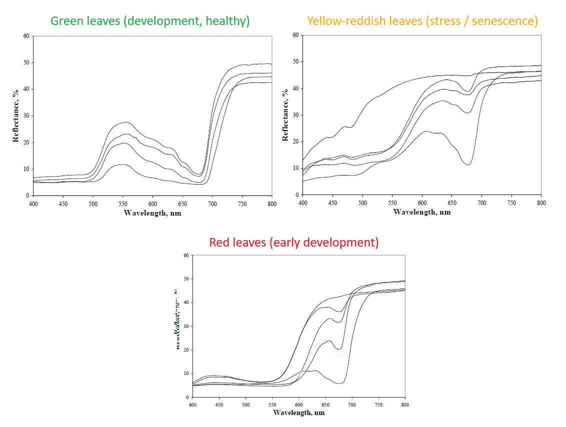 The progression from red (early development) through green (mature, healthy) to yellow-reddish (stress/senescence) leaves represents different physiological states that can be monitored remotely (Gitelson and Merzlyak 2001). Importantly, this highlights a challenge in remote sensing: both young developing leaves and senescing leaves can show elevated anthocyanin content, but for different physiological reasons. Distinguishing between these states requires temporal context—spring observations of red spectra likely indicate new growth, while autumn observations suggest senescence. Vegetation indices designed to capture these transitions must account for the changing relationships between pigments and the multiple roles of anthocyanins across the growing season (Richardson et al. 2018).