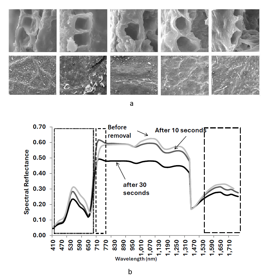 The electron microscopy images in Figure 6 show dramatic differences in leaf surface structure before and after wax removal, revealing the crystalline wax structures that coat healthy leaf surfaces. The spectral consequences of wax removal are striking: